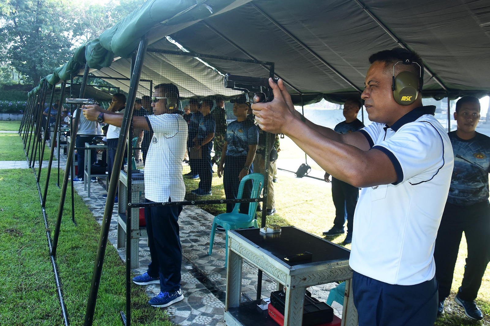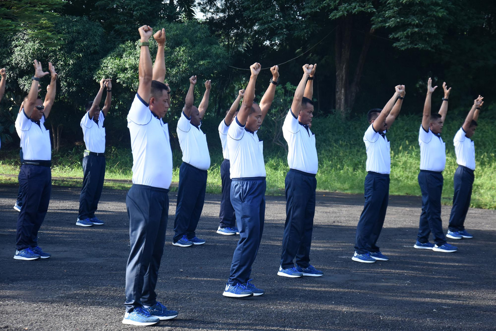 Kegiatan olahraga bersama kali ini diawali dengan melaksanakan peregangan, Senam Kesegaran Jasmani (SKJ) 88 dan diakhiri dengan menembak pistol.