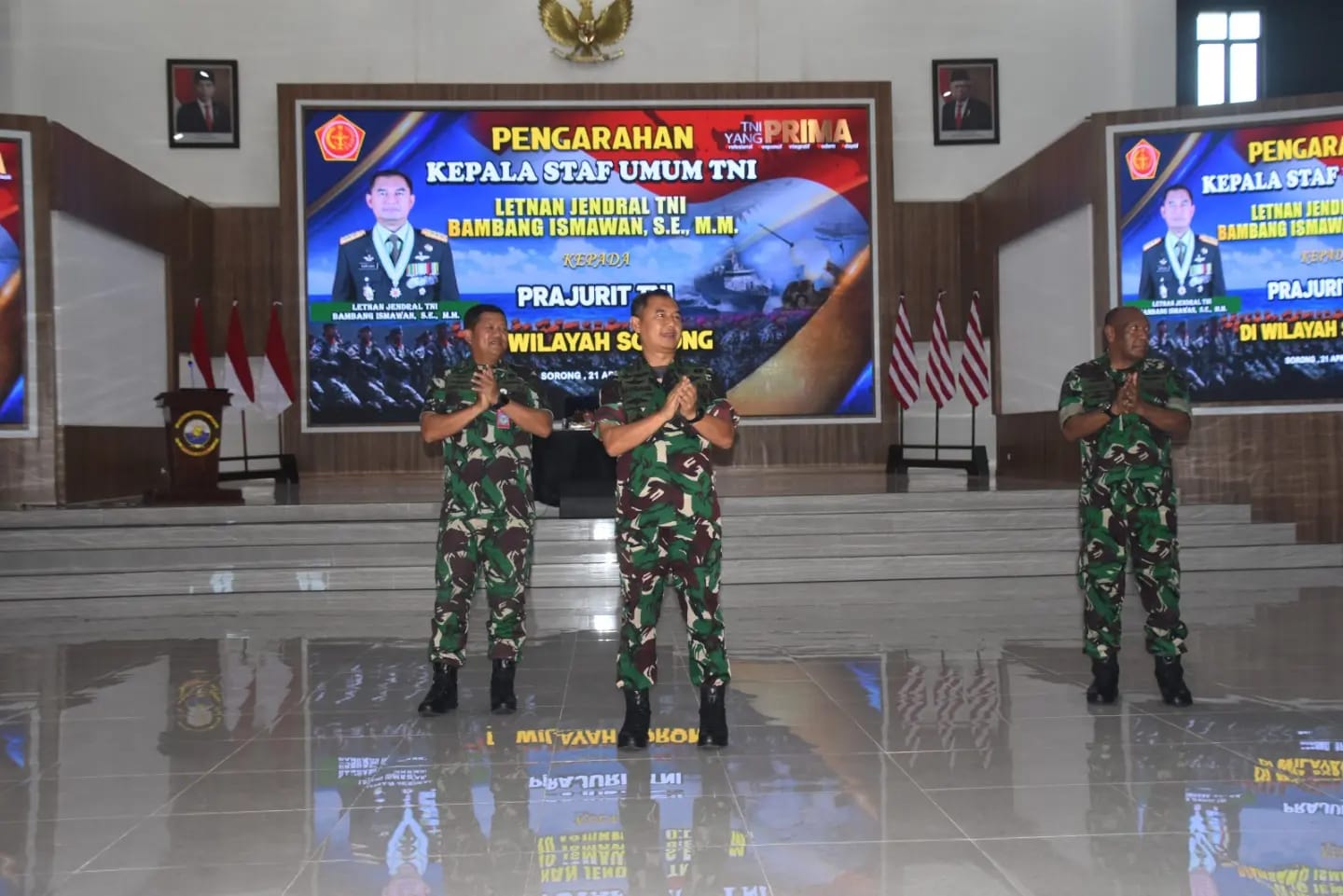 TNI AL, Dispen Kormar (Sorong). Komandan Pasmar 3 Brigjen TNI (Mar) Sugianto, S.Sos., M.M., mengikuti pengarahan Kepala Staf Umum TNI Letjen TNI Bambang Ismawan, S.E., M.M., dalam rangka Kunjungan Kerja Kasum TNI di wilayah Sorong bertempat di Gedung Serba Guna (GSG) Mas Pardi Mako Koarmada III, Distrik Salawati, Kabupaten Sorong, Papua Barat Daya. Minggu (21/04/2024).