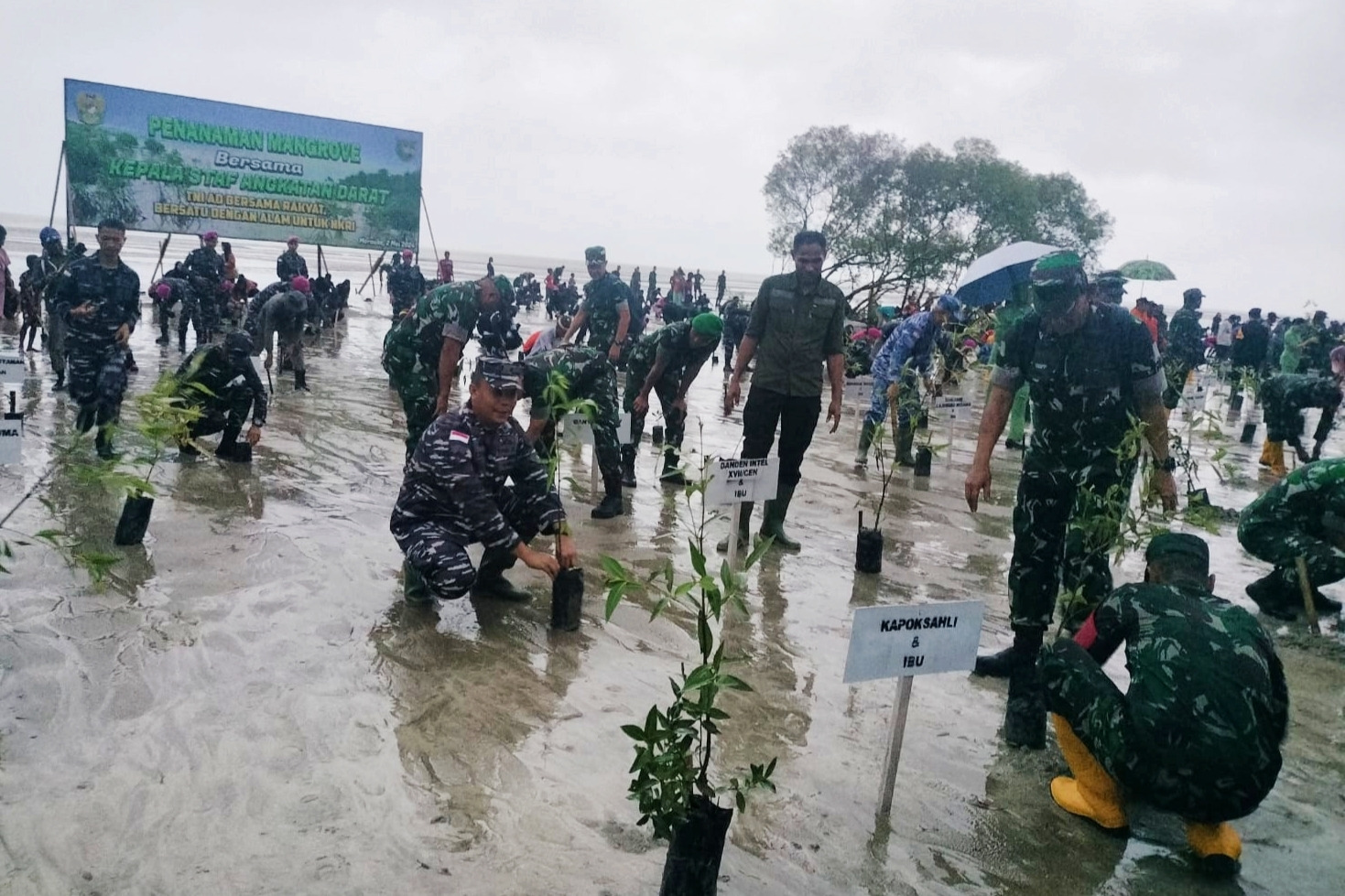 TNI AL, Dispen Korps Marinir (Merauke). Prajurit Yonmarhanlan XI Merauke mengikuti kegiatan penanaman Mangrove bersama Kepala Staf Angkatan Darat (Kasad) Jenderal TNI Maruli Simanjuntak di pesisir pantai Payum, Kampung Payum, Kel. Samkai, Distrik Merauke, Kab. Merauke, Prov. Papua Selatan. Kamis (02/05/2024).