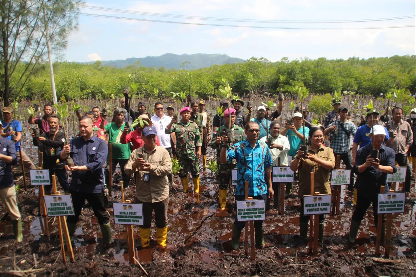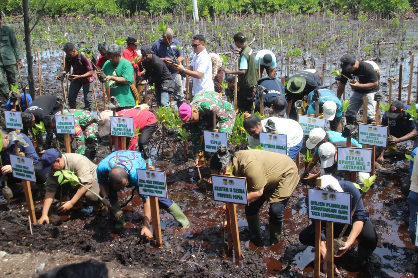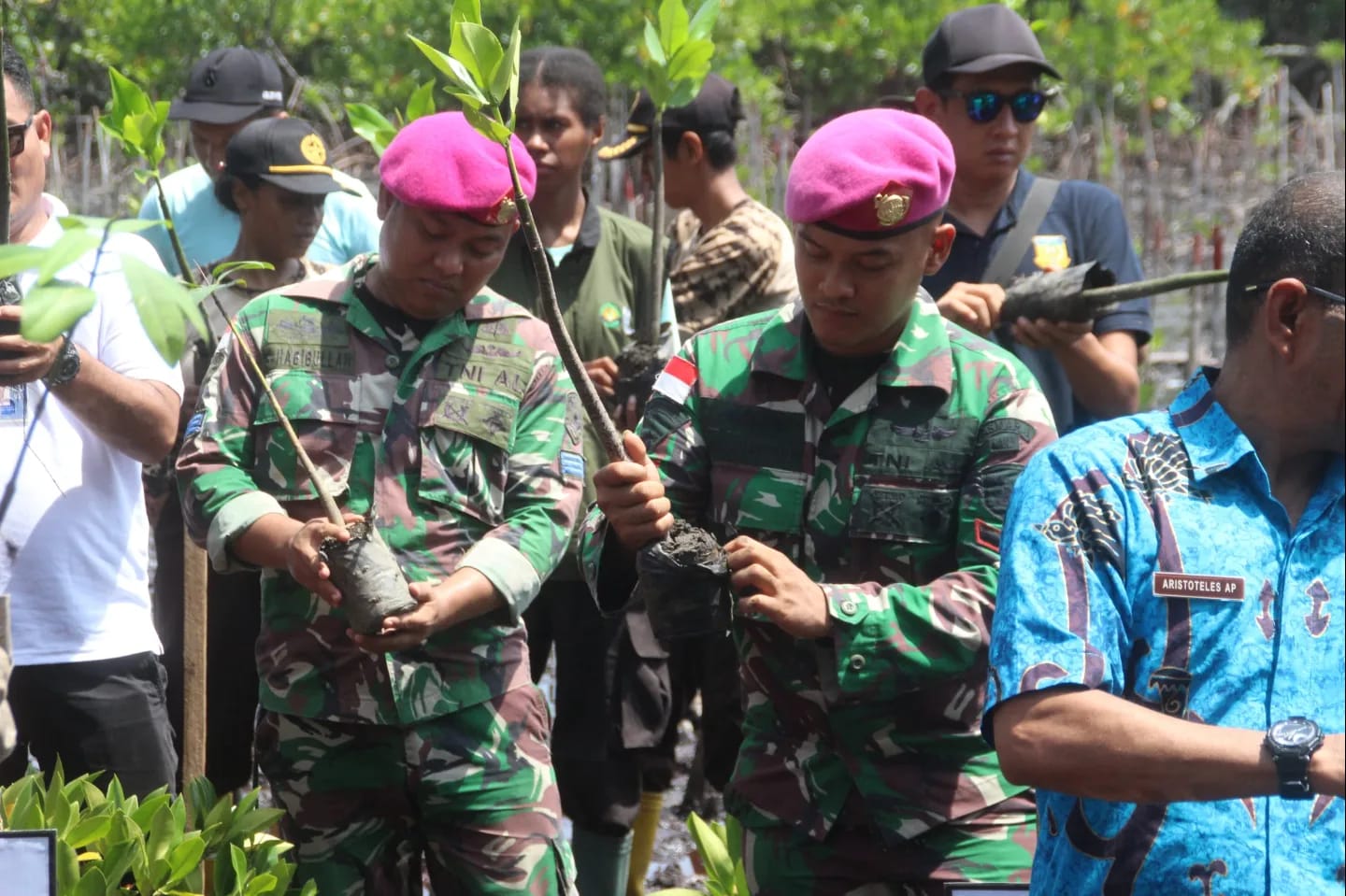 TNI AL, Dispen Kormar Jayapura. Dalam rangka melestarikan hutan mangrove, prajurit Batalyon Marinir Pertahanan Pangkalan (Yonmarhanlan) X Jayapura Pasmar 3 mengikuti Penanaman 25.000 Pohon Mangrove Nasional secara serentak di 25 Lokasi di Indonesia yang betempat di Pantai Ciberi, Kota Jayapura, Papua. Kamis (25/04/2024).