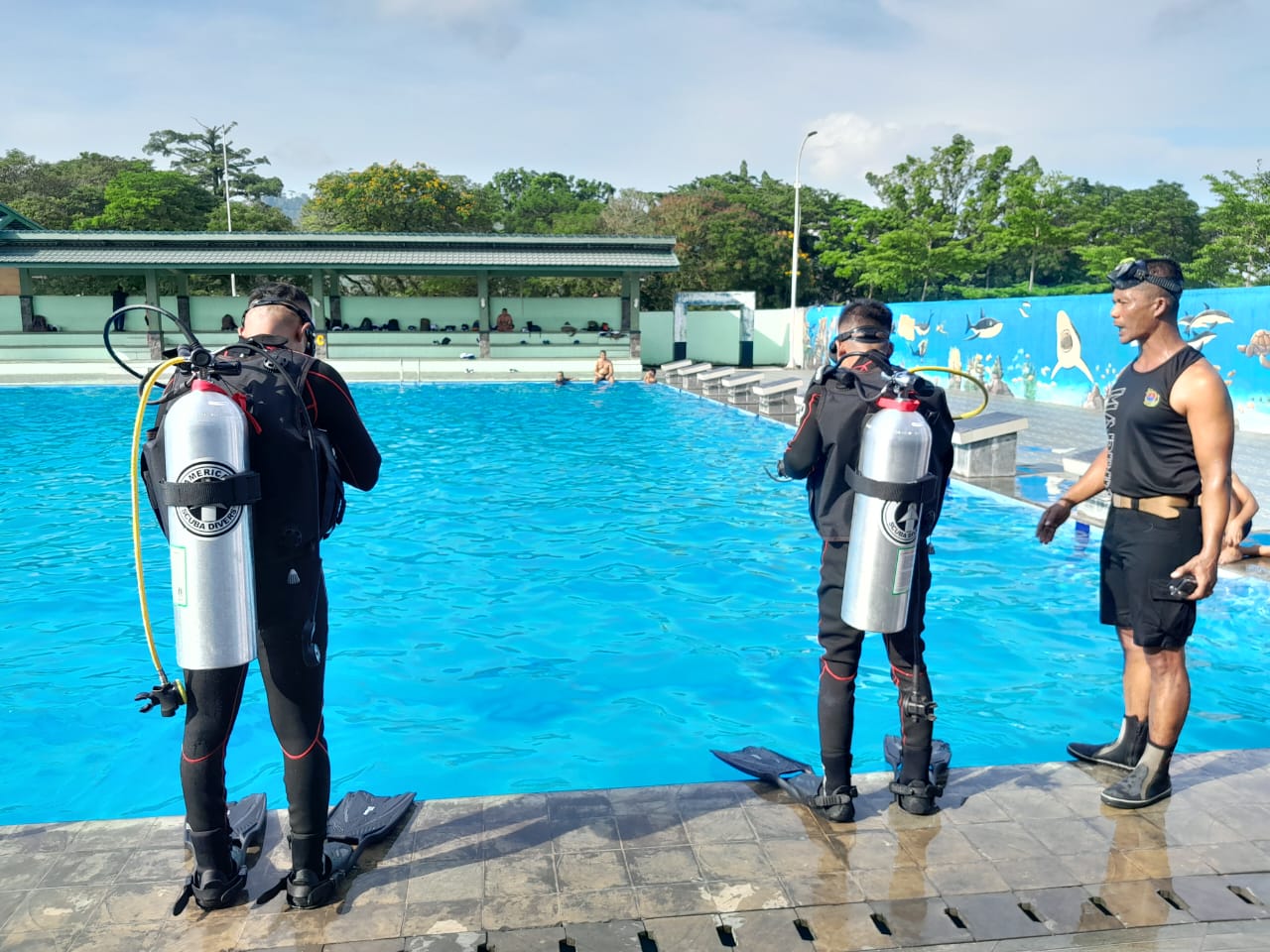 TNI AL, Dispen Kormar (Padang), Pasmar 1. Prajurit Batalyon Marinir Pertahanan Pangkalan ll Padang laksanakan pembinaan kemampuan renang dan selam yang dipimpin langsung Pasiops Yonmarhanlan ll Mayor Marinir Andri Winarno di Kolam Renang Tarandam, Kota Padang, Sumbar, Selasa (30/04/2024).