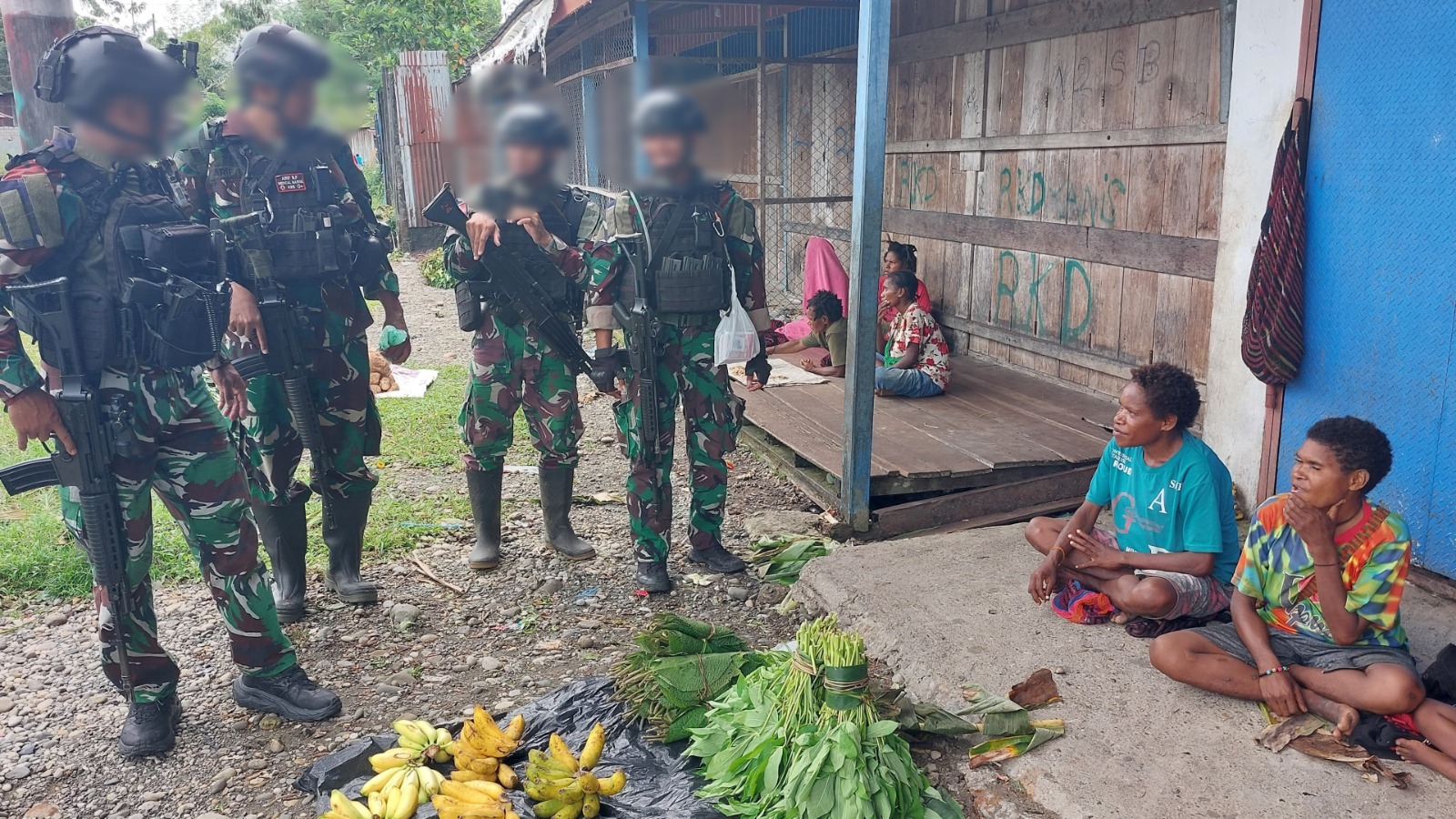 Dispen Kormar TNI Angkatan Laut (Yahukimo Papua Pegunungan). Prajurit Korps Marinir dari Satgas Pamtas Mobile RI-PNG, Yonif 7 Marinir/Gobang memborong hasil bumi yang dijual masyarakat di pasar tradisonal di Distrik Dekai, Yahukimo Provinsi Papua Pegunungan. Sabtu (11/05/2024).