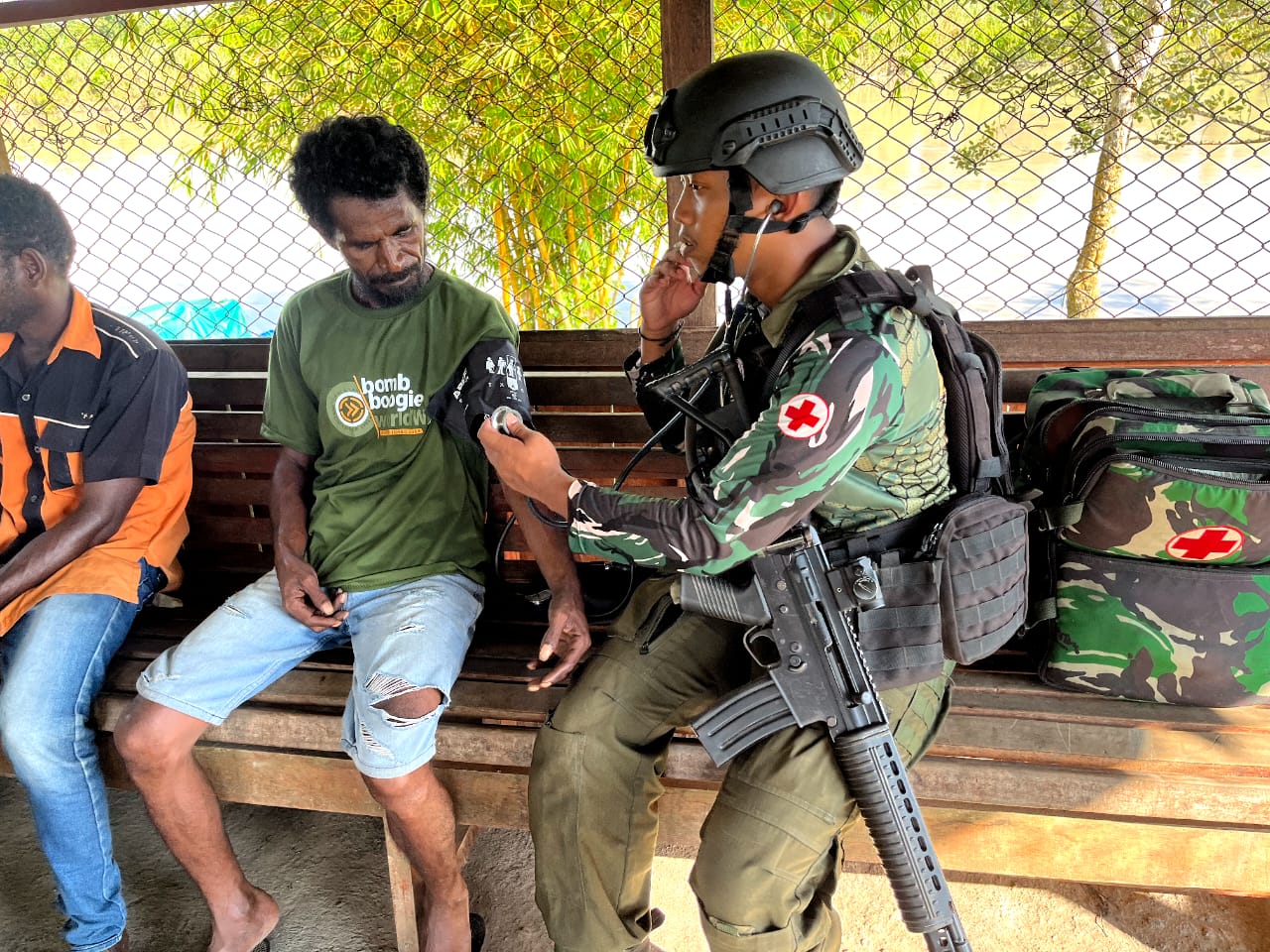 Dispen Kormar, TNI Angkatan (Yahukimo Papua). Prajurit Satgas Pamtas Mobile Yonif 7/Gobang Marinir, Koops Habema, dibawah pimpinan Lettu Laut (K) dr. Eko Dhamara, melaksanakan kegiatan bhakti sosial di daerah Distrik Dekai Papua.