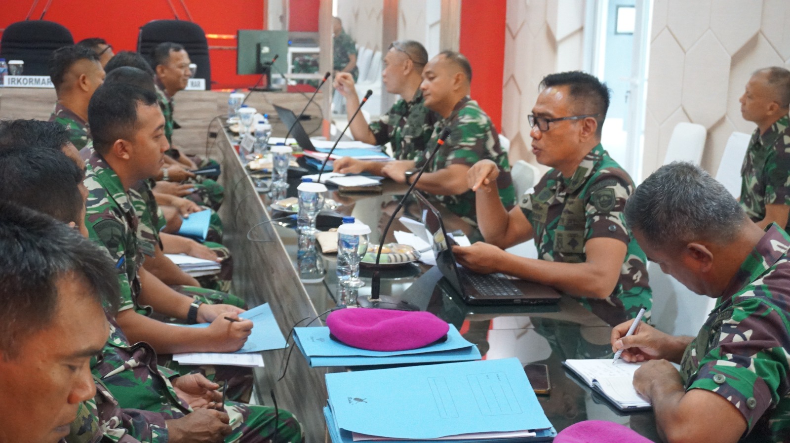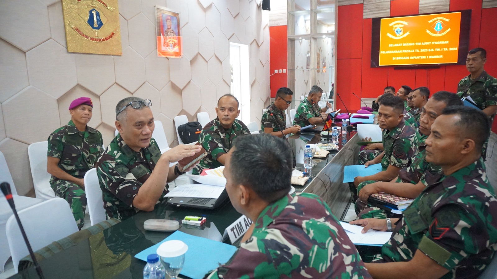 Komandan Brigade infanteri-1 Marinir (Danbrigif-1 Mar) Kolonel Marinir Isna Muksin Abdilah, M. Tr. Hanla., S.E menerima Tim Wasrik dari Inspektorat Korps Marinir (Itkormar) di ruang rapat Brigif-1 Marinir Cilandak Jakarta Selatan.
