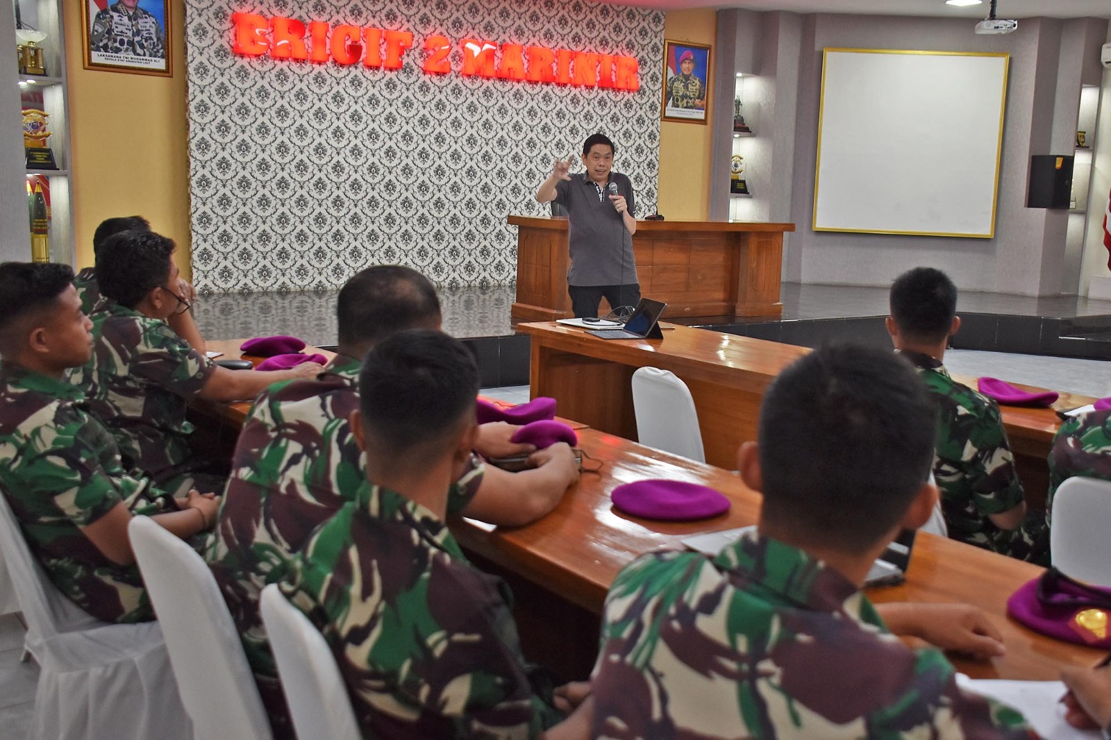 TNI AL, Dispen Kormar (Sidoarjo). Dalam rangka meningkatkan kemampuan dibidang Informatika, prajurit Brigif 2 Marinir mendalami Ilmu Informasi dan Tekhnologi (IT) di ruang rapat Brigif 2 Marinir Gedangan, Sidoarjo, Jawa Timur. Rabu (27/03/2024).