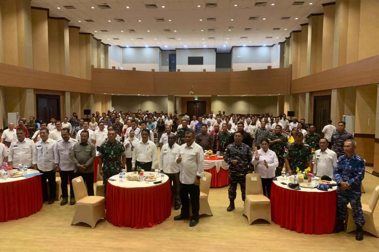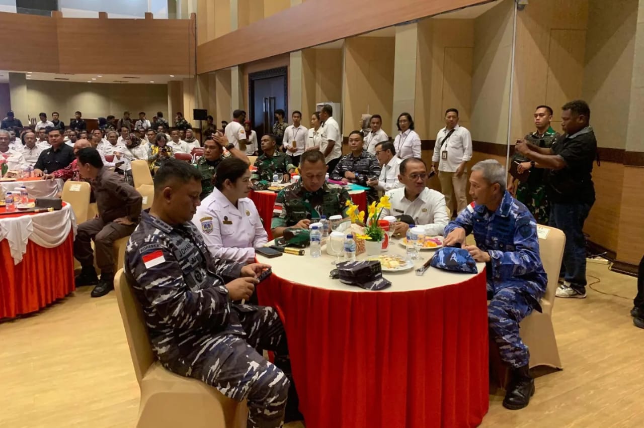 TNI AL, Dispen Kormar (Merauke). Komandan Batalyon Marinir Pertahanan Pangkalan XI Mayor Marinir Deni Kusmana, menghadiri Rapat Koordinasi Menteri Pertanian dalam rangka meningkatkan produksi pangan nasional melalui Pengembangan Area Food Estate di Ruang Auditorium Lantai 2 Kantor Bupati Merauke, Jl. Brawijaya, Kab. Merauke, Papua Selatan. Rabu (17/04/2024).