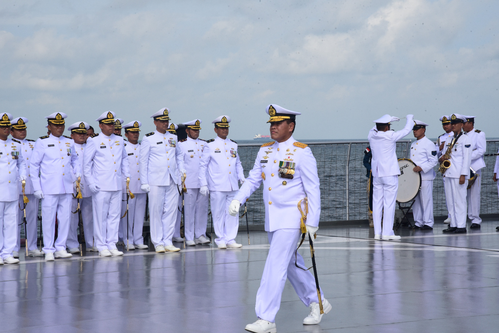 TNI AL. Dispen Kormar (Jakarta)- Wakil Komandan Korps Marinir (Wadan Kormar) Brigadir Jenderal TNI (Mar) Suherlan, menghadiri Upacara dan Tabur Bunga dalam rangka memperingati Hari Dharma Samudera tahun 2024 yang digelar di atas geladak KRI Banda Aceh-593, yang bersandar di dermaga Komando Lintas Laut Militer, Jl. Pelabuhan Tanjung Priuk, Koja, Jakarta Utara, Senin (15/01/2024).